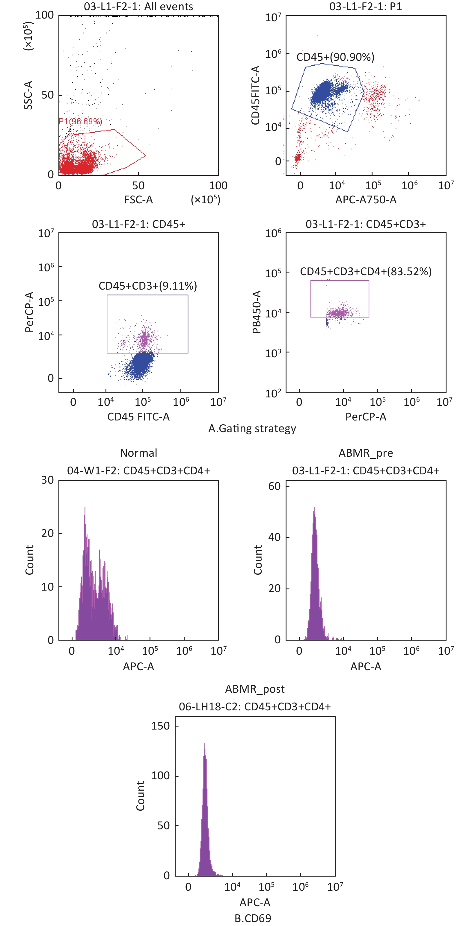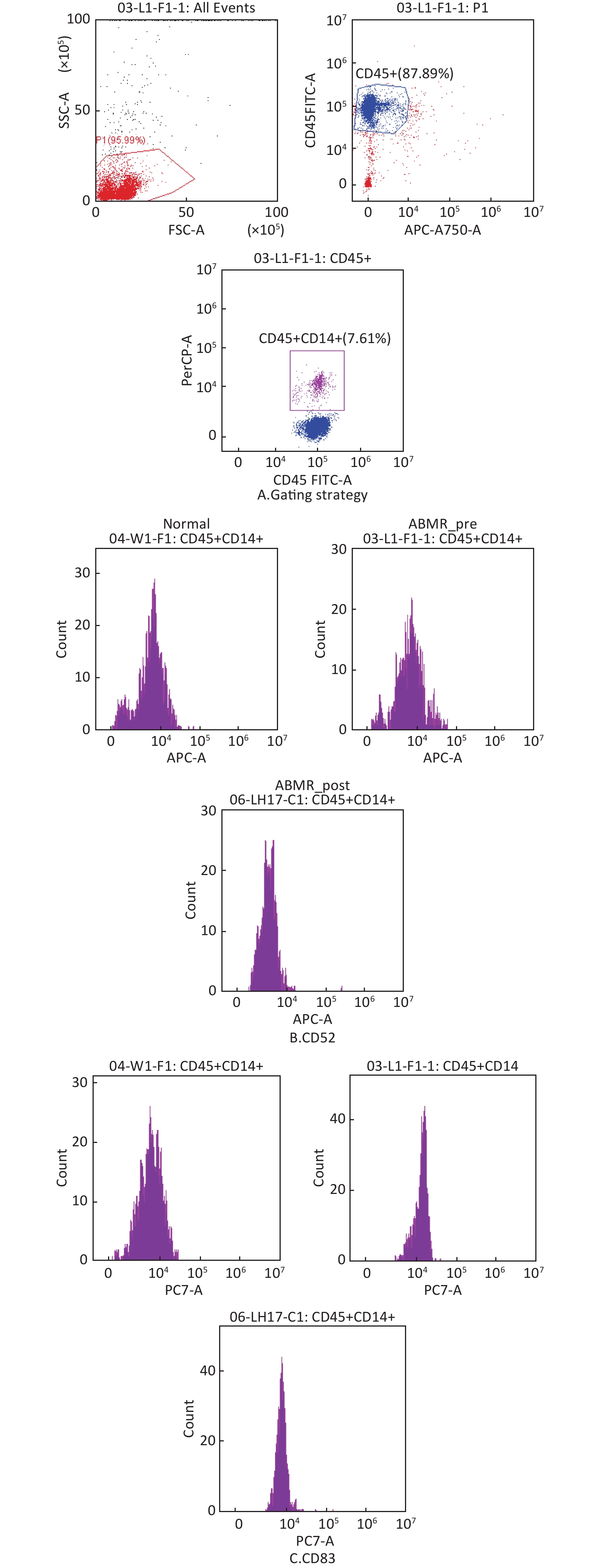 AIM: Based on single-cell sequencing analysis, the underlying mechanism of antibody-mediated rejection (ABMR) in kidney transplant recipients. METHODS: Recipients with 6 months or more after kidney transplantation were selected as research subjects, and high-resolution scRNA-seq analysis of immune cell subsets in peripheral blood mononuclear cells (PBMC) was performed using single-cell RNA sequencing (scRNA-seq) technology. Flow cytometry was used to examine the effect of differential genes on renal transplant ABMR in different immune cell populations. RESULTS: This study analyzed differential gene expression between ABMR patients and healthy controls using single-cell sequencing technology, identifying CD69, CD83, CD52, CD74, and CX3CR1 as key differentially expressed genes. In classical monocytes, ABMR patients exhibited increased CD83 and CD52 gene expression levels compared to the control group, which showed a downward trend after treatment. Regarding initial CD4+T cells, ABMR patients demonstrated significantly reduced CD69 gene expression. In NK cells, ABMR patients displayed decreased CX3CR1 gene expression initially, with further reduction in its geometric mean value post-treatment. Conversely, the geometric mean value of CD74 showed an increasing trend. CONCLUSION: In classical mononuclear cells, upregulated expression of CD83 and CD52 genes correlates with enhanced antigen-presenting cell functionality, thereby promoting the development of antigen-bonded microenvironment remodeling (ABMR). In initial CD4+T cells, elevated CD69 gene expression is associated with T cell activation and proliferation, further contributing to ABMR progression. Conversely, downregulated CX3CR1 gene expression in NK cells relates to impaired immune surveillance mechanisms, which partially inhibits ABMR formation.
